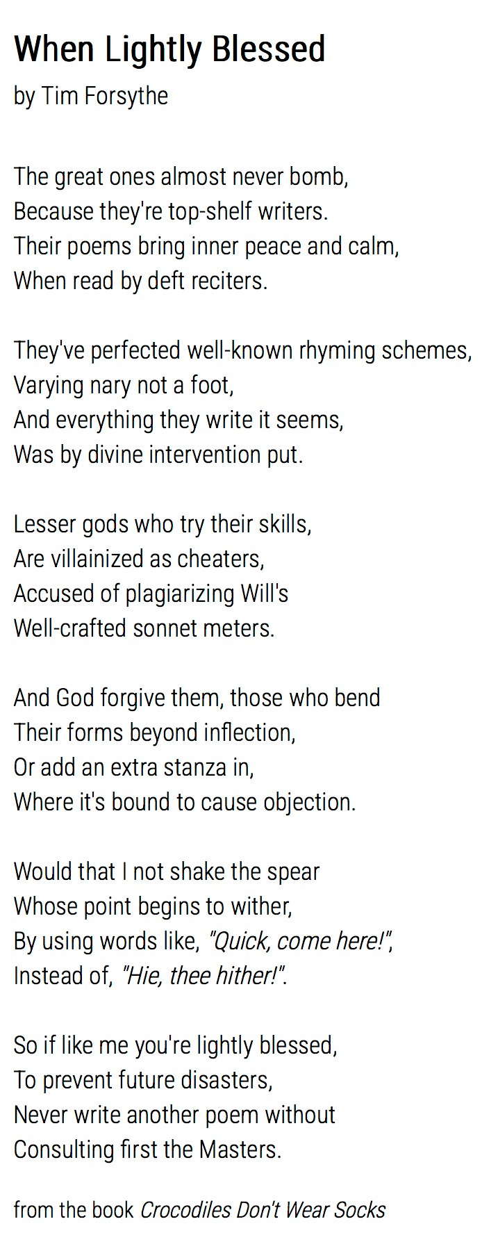 Recently I’ve read several essays speaking to the importance of poetry in addressing issues of personal and cultural importance. Of course, I wholeheartedly agree with this, but those same essays declared, somewhat insistently, that poetry should not be light-hearted, and it should never break the fourth wall. They said it’s a rule or something equally silly. Here’s a poem I wrote that is not only is funny and self-referential, but it also pokes fun at the acclaimed literati in the process. I’m sure they’re up to some light ribbing.